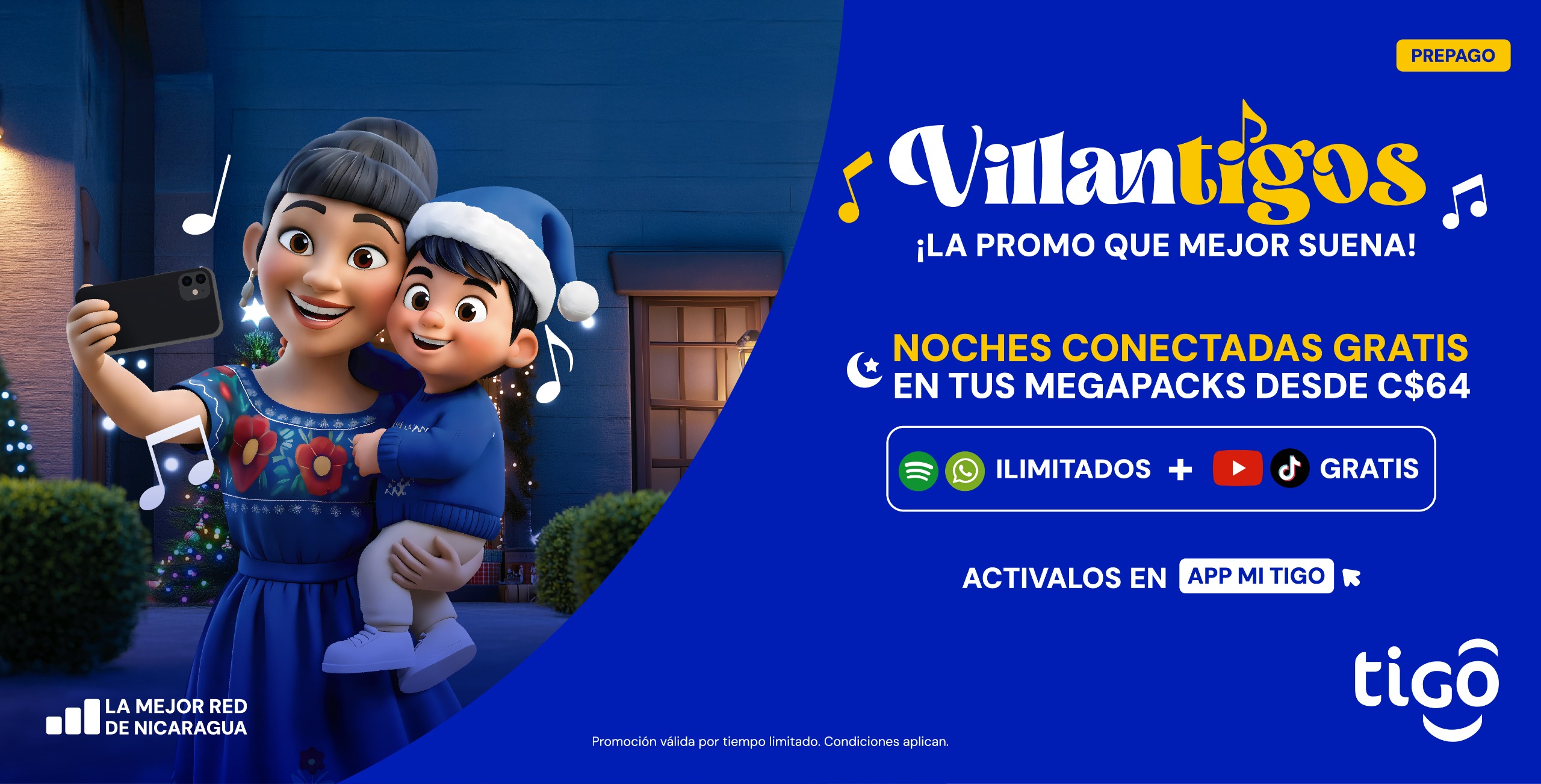 Porque sabemos que las noches son para compartir, reír y estar cerca de quienes más querés, todos los clientes prepago que activen sus Megapacks desde 64 córdobas recibirán GIGAS GRATIS para disfrutar en sus Noches Conectadas, junto con Música y WhatsApp ILIMITADO. Además, podrán seguir disfrutando YouTube, TikTok y sus Redes Sociales favoritas GRATIS, manteniéndose conectados en todo momento.