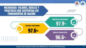 Por su parte, el Gerente General de la Firma, Raúl Obregón, manifestó el estudio reveló que los valores cristianos, las prácticas solidarias y los ideales socialistas continúan siendo percibidos como los principales fundamentos de la nación, con niveles de respaldo superiores al 96 por ciento.