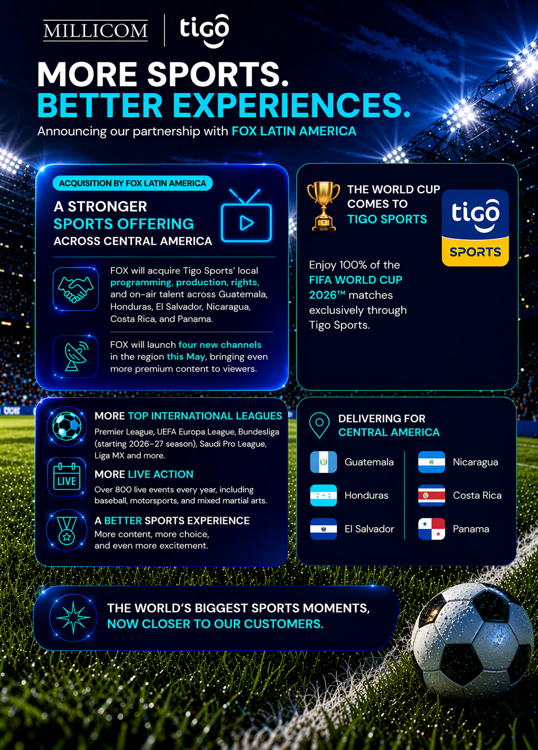A partir de esta adquisición, los clientes de Tigo Centroamérica accederán a una oferta ampliada que combinará contenido deportivo local con un portafolio internacional de primer nivel, incluyendo algunas de las ligas más relevantes del mundo como la Premier League, UEFA Europa League, Bundesliga (a partir de la temporada 2026–27), Saudi Pro League y Liga MX, así como más de 800 eventos deportivos en vivo al año en disciplinas como béisbol, automovilismo y artes marciales mixtas.